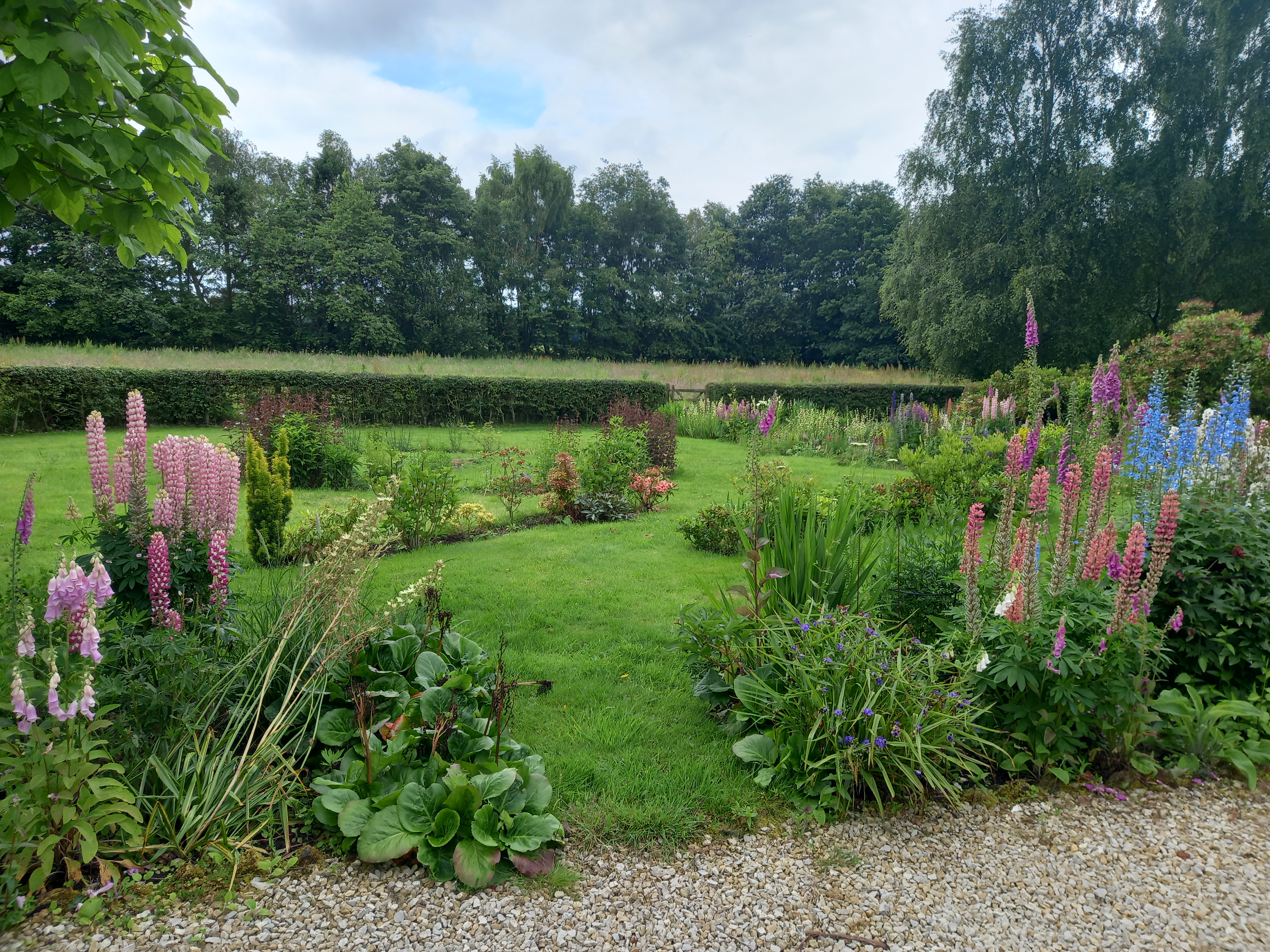 Long Borders - 2 parallel bordes aproximately 30 yards long with a semi circular seating area half way along. Packed with colour in summer and awash with polinating insects.