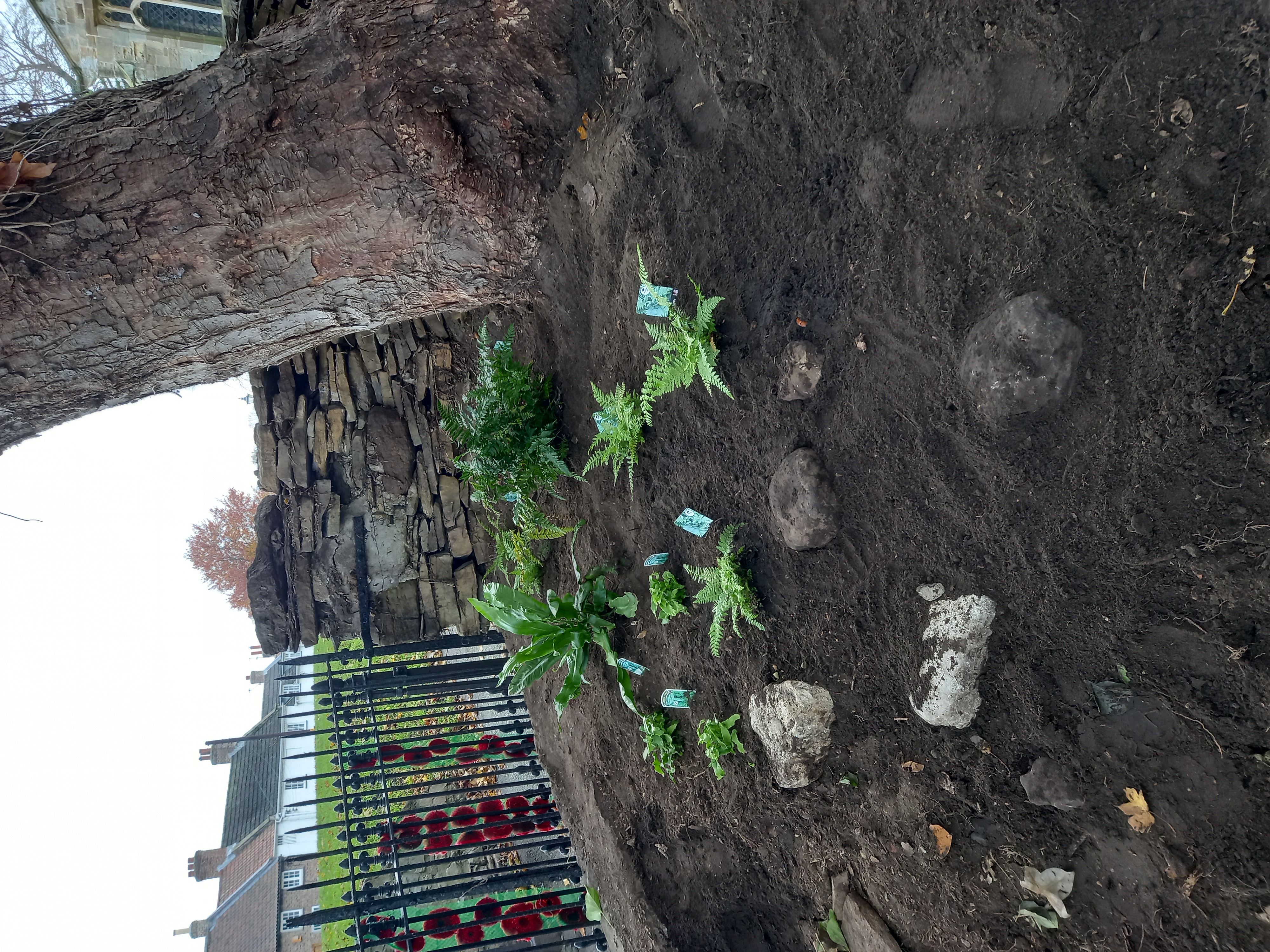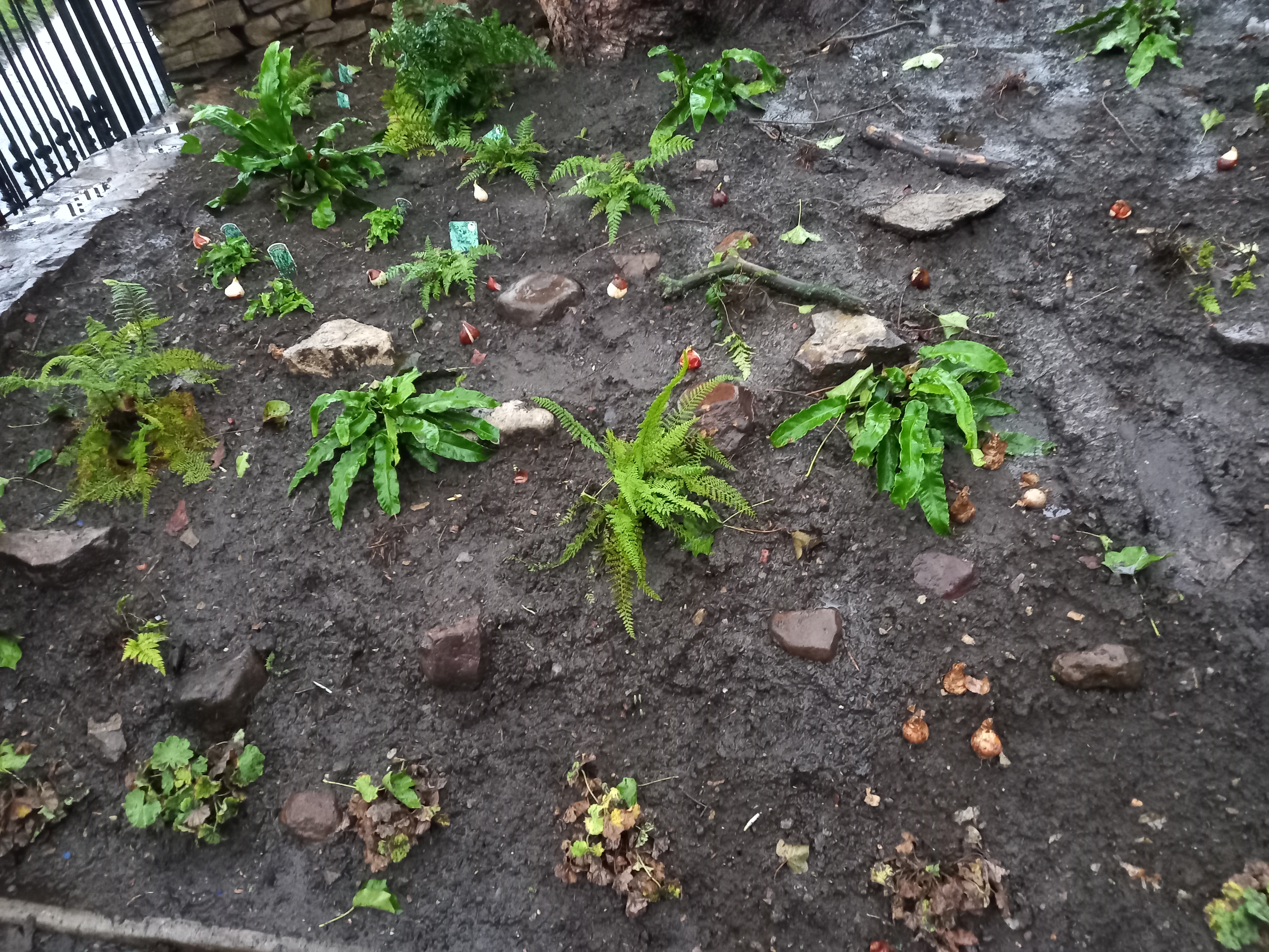 Wilderness - an area of spring bulbs, Snowdrops, Daffodils and Bluebells, which when finished is cut down to leave a partially shaded lawn with shrubs planted intermittently. At the end of the wilderness there is the makings of a dry garden, mainly grasses and Iris sibirica at present.