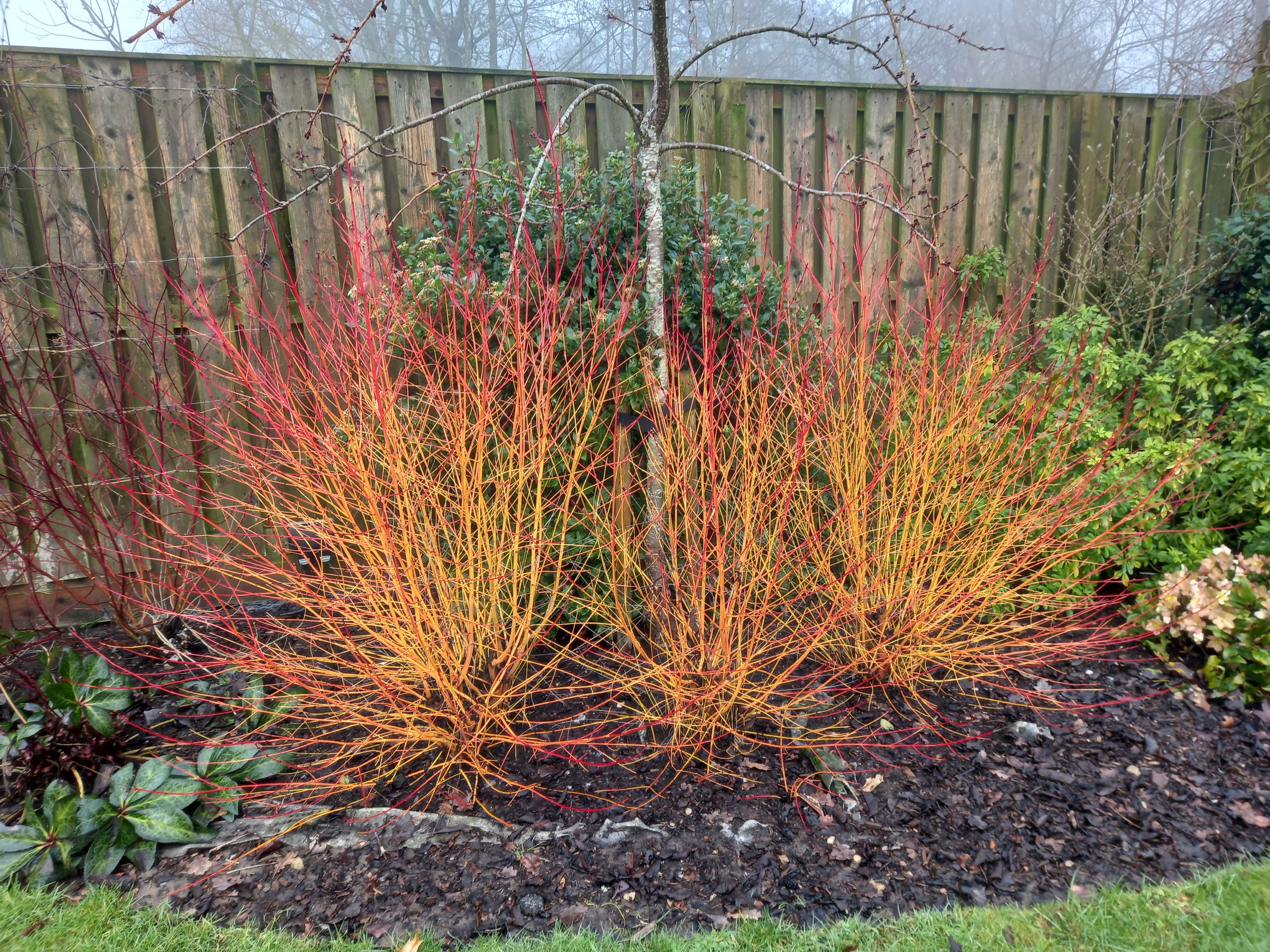 Spring and winter garden - Very much in its infancy, this is an area of spring bulbs and diferent dogwoods and a few willows, beneath a canopy of Field Maple and Walnut trees. In summer the centre is filled with Campanula.